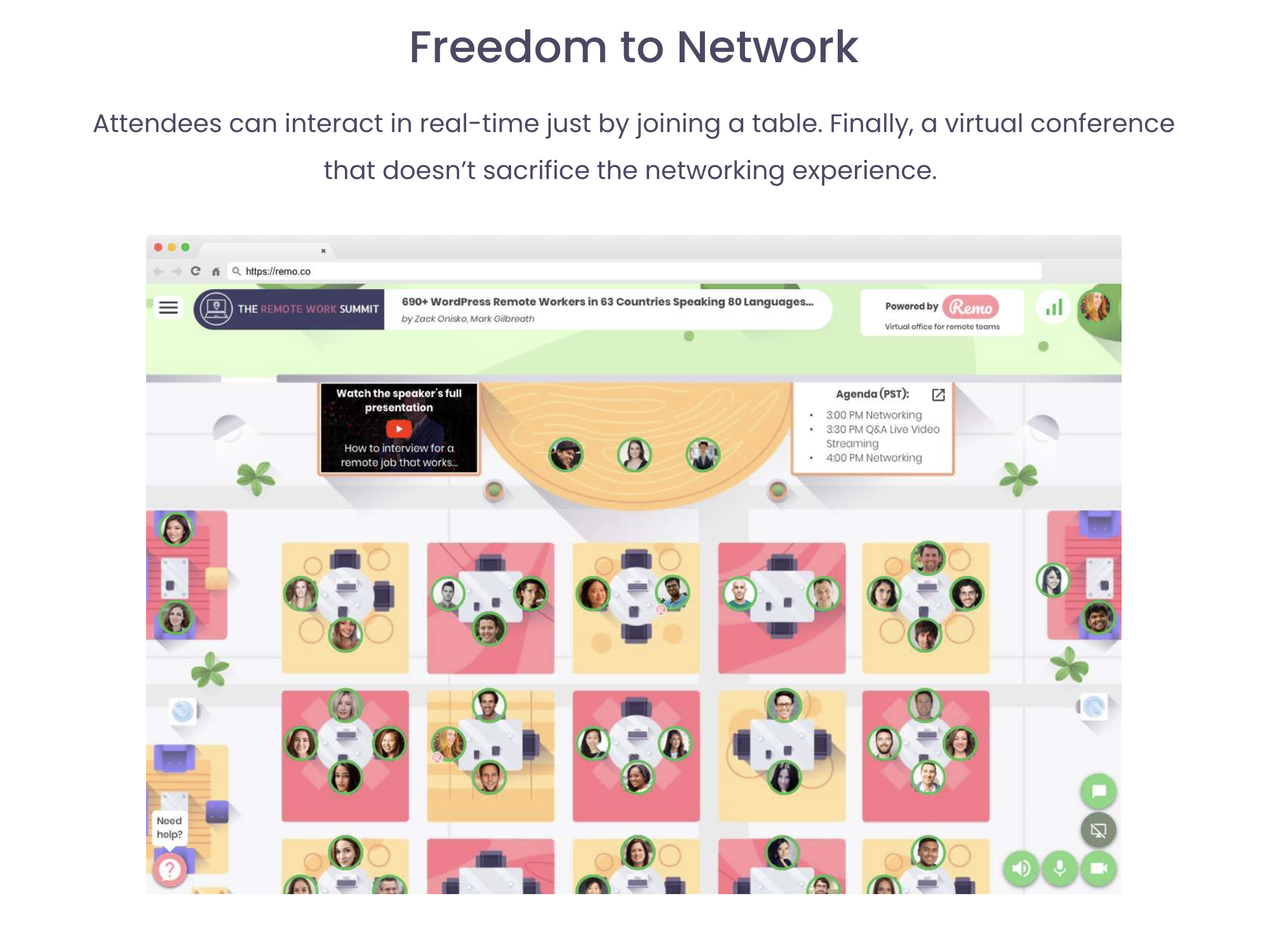 We hear you, nothing beats an in-person, face-to-face experience, specifically when it comes to networking and the serendipitous connections made with fellow attendees. But don’t worry, our signature emphasis on driving meaningful connections is still front and center. In an effort to replicate as much as we can of the in-person experience, we will host our networking sessions on Remo, a leading platform that humanizes online events. The platform looks exactly like a venue with different tables where attendees can connect one-on-one or in small groups with others.